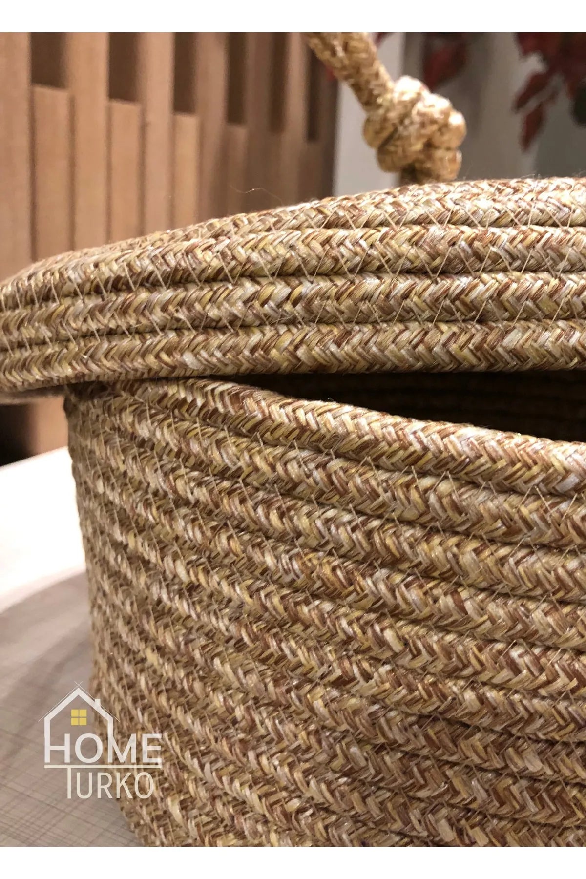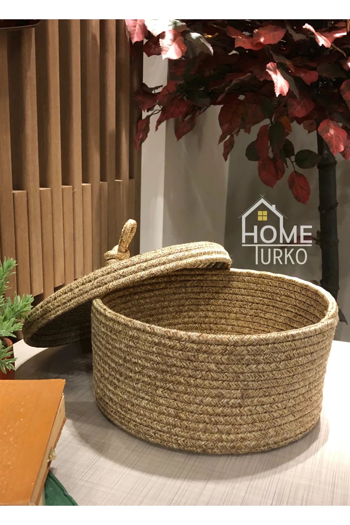 Bohem Yuvarlak Kapaklı Sepet Düzenleyici - Hasır / Büyük Boy - 25cm x 15 cm