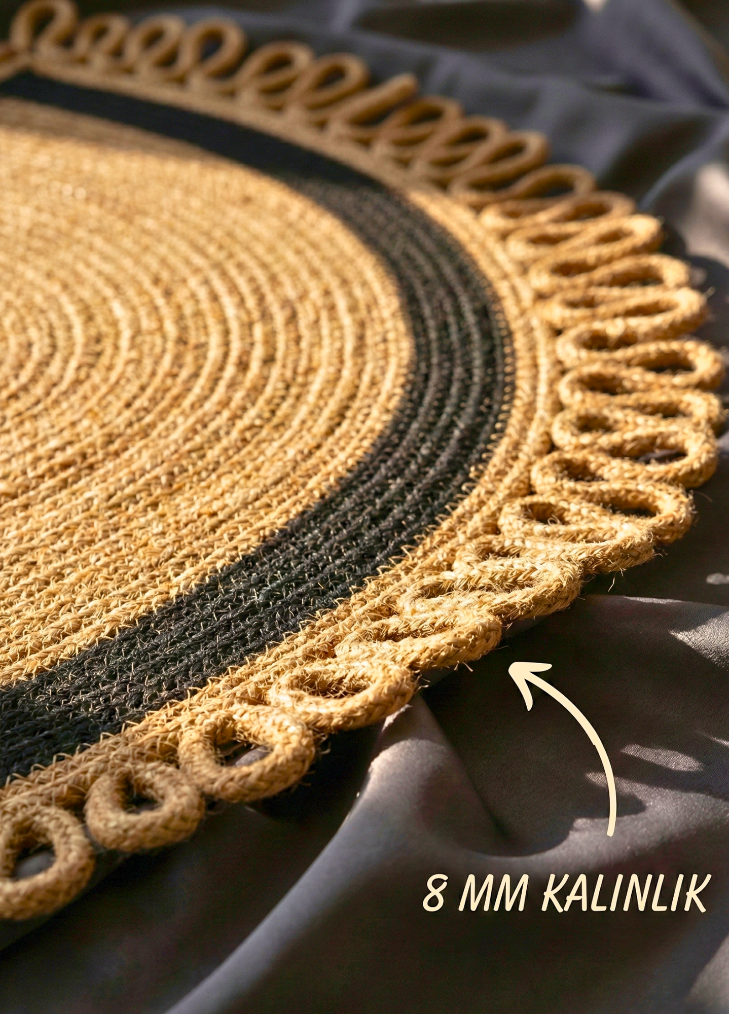 Sıradan paspaslardan sıkılanlar için; doğal jütün rustik havasını, renkli polip halatın modern dokunuşuyla birleştiren bu özel "loop" (döngü) kenarlı tasarım, tamamen el işçiliği ile üretilmiştir. Özgün tasarımıyla evinizin girişinde terkarsız karşılama sunun.